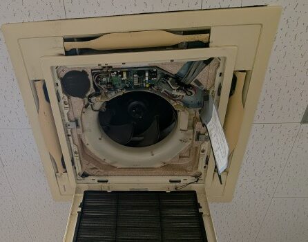 事務所や店舗、体育館などの広い空間で使われているエアコンの多くは、天井の中に設置されている「はめ込みタイプ(天井埋め込み型)」です。見た目はすっきりしていますが、実はこのタイプのエアコン、洗浄には非常に多くの注意点があります。